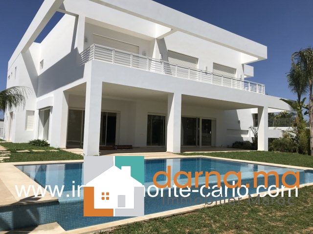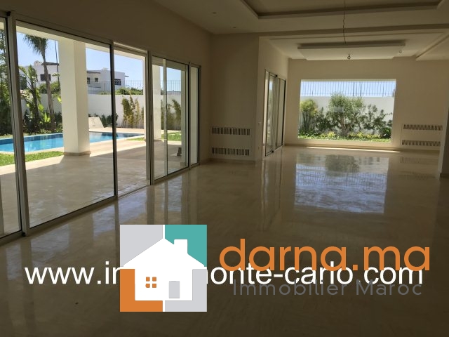 Splendide villa moderne neuve à Souissi Rabat, villa bien ensoleillée et calme sécurisée et très agencée avec piscine chauffage central, un beau jardin  clôturé privatif avec puit d’eau,  climatisations réversible dans toutes les pièces, des panneaux solaire pour l’eau chaude vidéophone, la villa construite sur 3 niveaux et se compose d’une grande réception avec cheminée, salle d’eau pour les invités, un séjour avec cheminée, une salle de bain, une grande cuisine moderne, à l’étage 5 chambres chacune avec sa salle de bain et placard, dont un master room avec 2 dressing( homme et femme) terrasse et salle de bain avec jacuzzi et douche,  au sous sol une deuxième cuisine une grande salle et logment de personnel avec salle de bain et une grande débarras, coté extérieur : un grand garage automatique, un logement de gardien avec salle de bain… Pour plus d’informations ou visite n’hésitez pas de contacter notre agence immobilière Immo Monte-Carlo au N° de tél: +212661464037/ +212661212547ou Tél/Fax: +212537755043 ou par E-mail : immomontecarlo@Cette adresse e-mail est protégée contre les robots spammeurs. Vous devez activer le JavaScript pour la visualiser. ou visitez notre site www.immomonte-carlo.com ou  rendez-vous au 15. Av, Al Abtal N°4  ,  Agdal RABAT MAROC