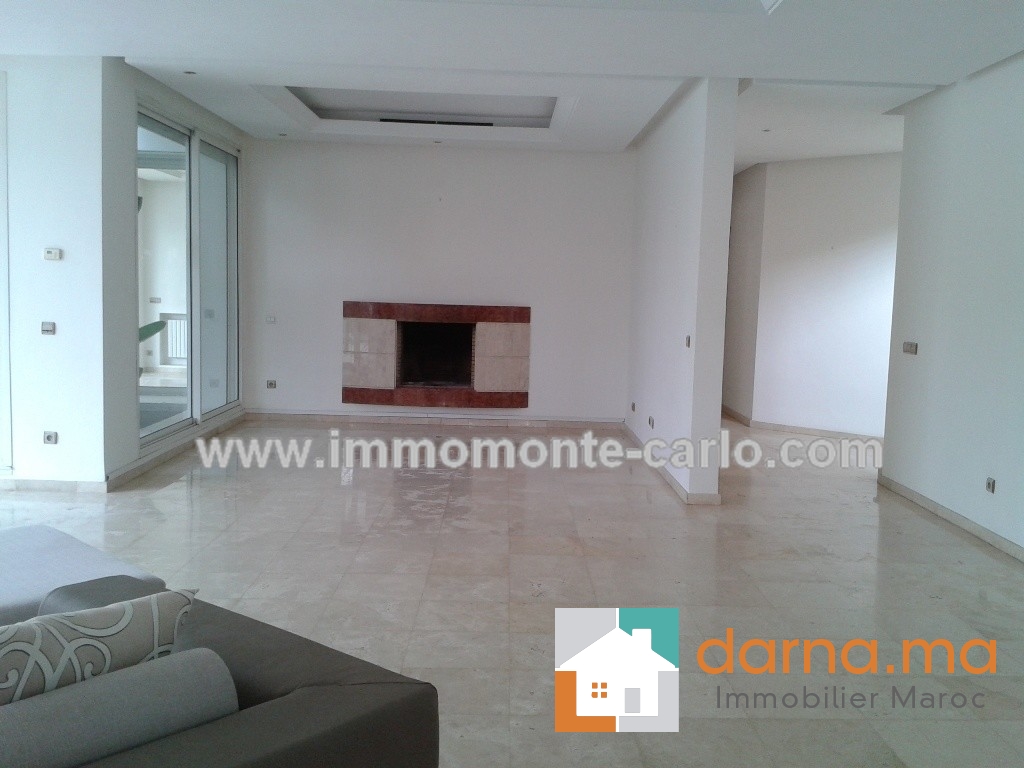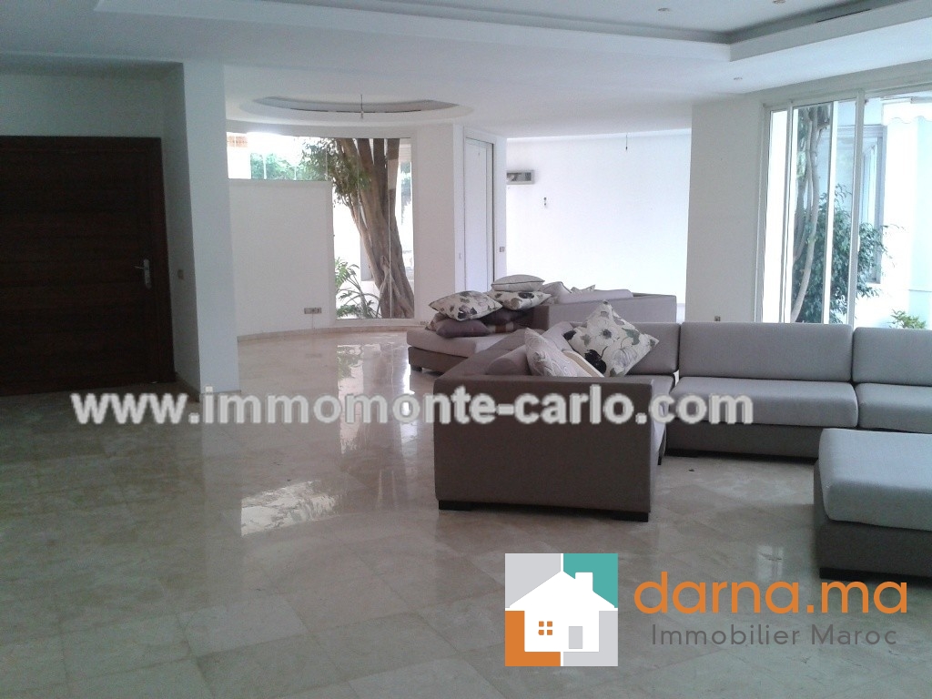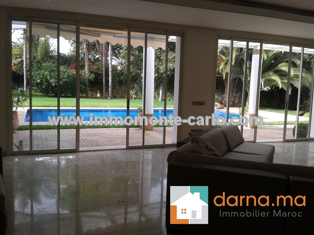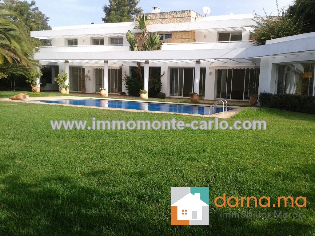 Très belle villa de standing avec piscine, un beau grand jardin, chauffage central et climatisation dans toutes les pièces, Villa éclairé dans un endroit calme et proche de toutes les commodités, construite sur 3 niveaux et composée de: cinq chambres à coucher dont une suite parentale avec dressing salle de bain, salle de sport et sauna, 3 salles de bain, très jolie réception, une grande terrasse donnant sur le jardin et la piscine, salle d’eau pour la réception, coin cheminée, cuisine équipée, buanderie, pièce de stockage, grand garage avec portail automatique, logement du personnel et du gardien..... Pour plus d’informations ou visite n’hésitez pas de contacter notre agence immobilière Immo Monte-Carlo au N° de tél: +212661464037/ +212661212547ou Tél/Fax: +212537755043 ou par E-mail : immomontecarlo@Cette adresse e-mail est protégée contre les robots spammeurs. Vous devez activer le JavaScript pour la visualiser. ou visitez notre site www.immomonte-carlo.com ou  rendez-vous au  15 .Av, Albat N°4,  Agdal RABAT MAROC